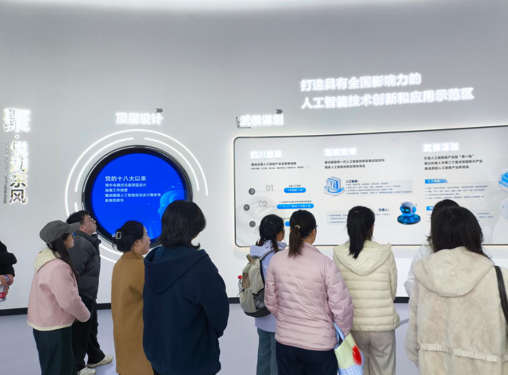 随后,支部一行来到成都市武侯区人工智能产业核心区——悦湖科技城进行学习交流。在悦湖科技城展示馆(武侯区人工智能·机器人产业赋能中心),党员同志们通过专业讲解、沉浸式展陈与前沿科技互动,近距离观摩了人工智能与高端软件、关键材料等领域的创新成果与应用场景,系统了解了国家人工智能产业发展战略、地方产业布局及悦湖科技城以“AI+”为核心的产业生态构建。