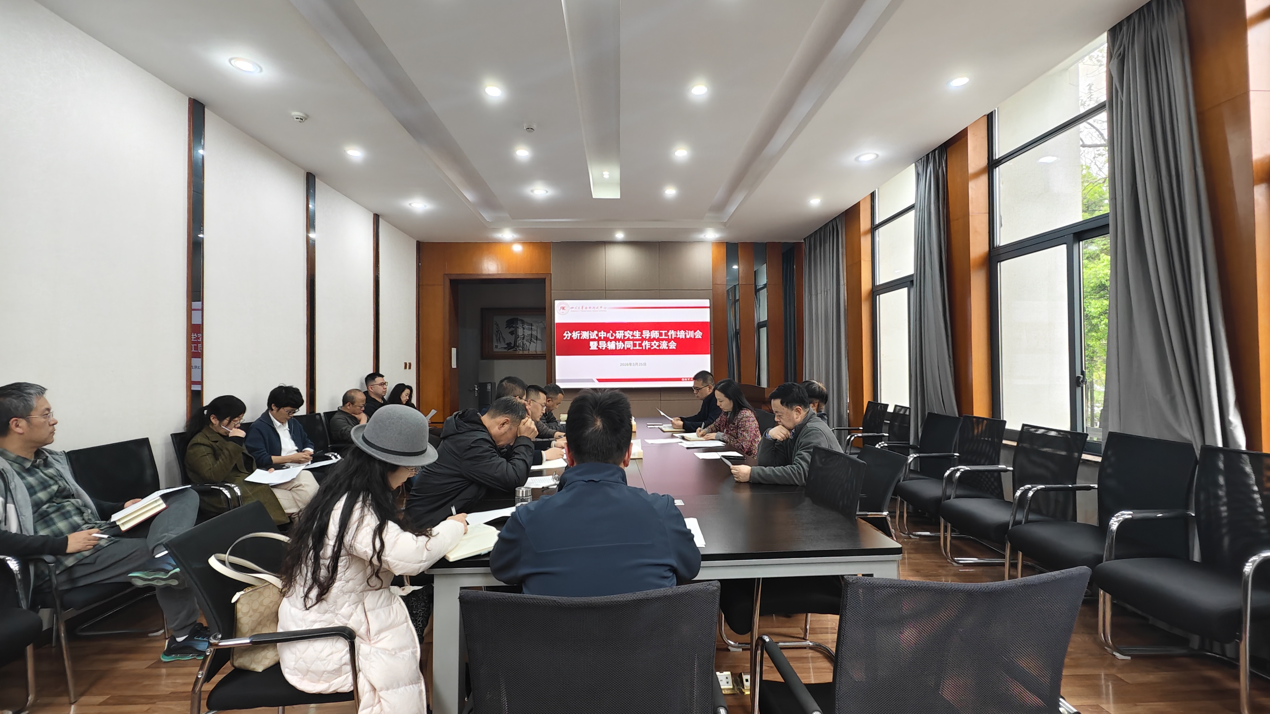 2026年3月25日下午,分析测试中心召开研究生导师培训暨导辅协同工作交流会。中心党总支书记、主任吴兰,党总支副书记谭新禹,全体研究生导师、辅导员及教务老师参会,会议由谭新禹主持。